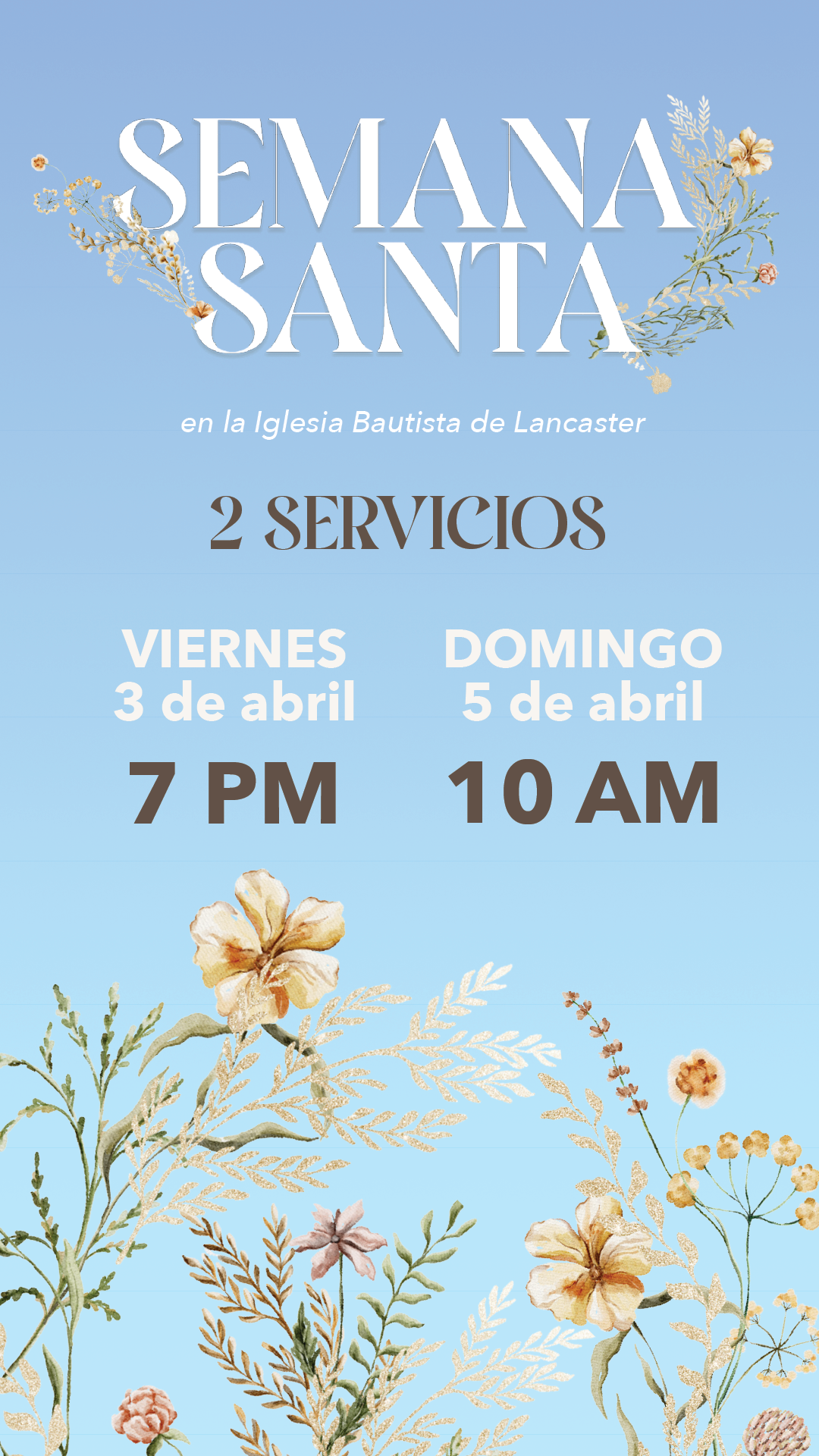 Horario3 de abril 7:00pm - Servicio de Crucifixión Dirección44538 40th Street East, Lancaster, CA 93535 Recursos para la redes socialesDescarga estas imágenes de redes sociales para compartir en tus perfiles sociales. Agrega un título y etiqueta a tus amigos. Incluya a qué servicio asistirá y asegúrese de hacer un seguimiento con sus amigos después para conocer su experiencia. Dispositivo móvil:Toque y mantenga presionada la imagen y seleccione 'Descargar'.